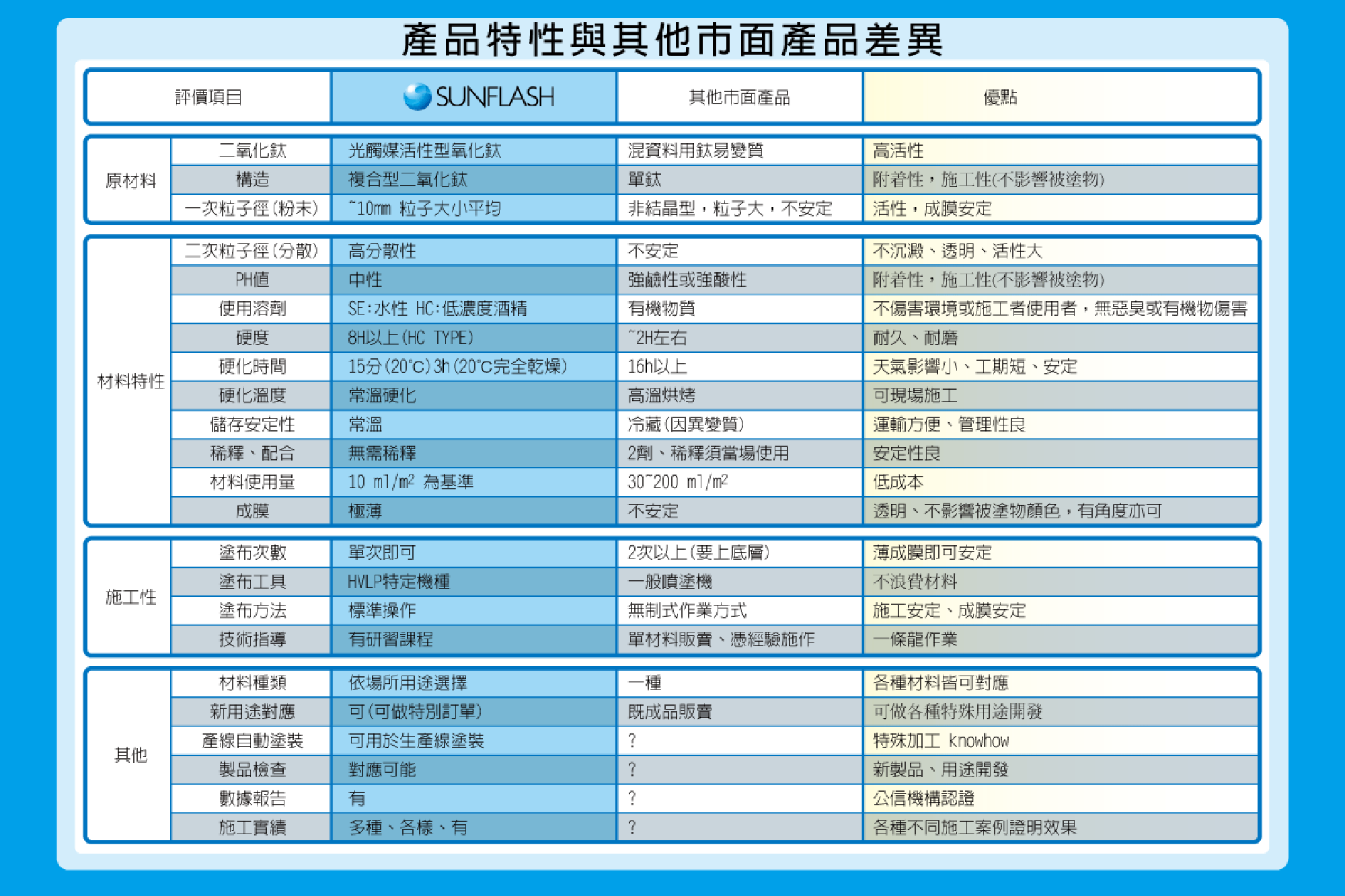 SUNFLASH長效型奈米光觸媒鍍膜,是本公司以二氧化鈦為基材所開發的特殊分散及附著技術,使材料微細的分子能夠平均散佈,並有效附著於被塗物上,形成一道超薄膜,利用觸媒轉換功能,有效的分解散布在空氣中,對人體有害的有機物質,進而改善空氣品質。